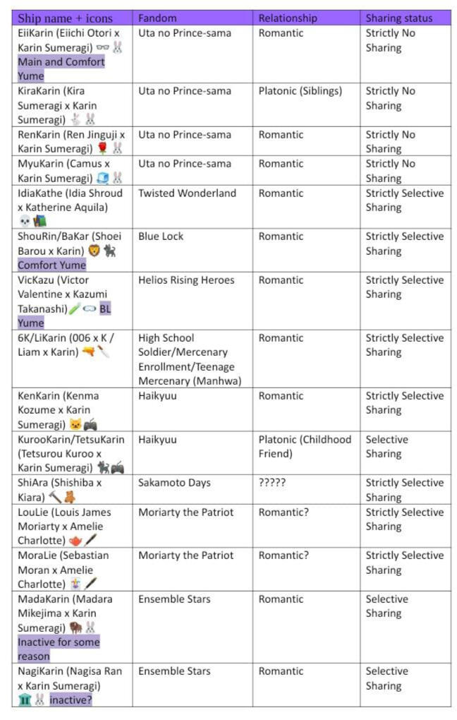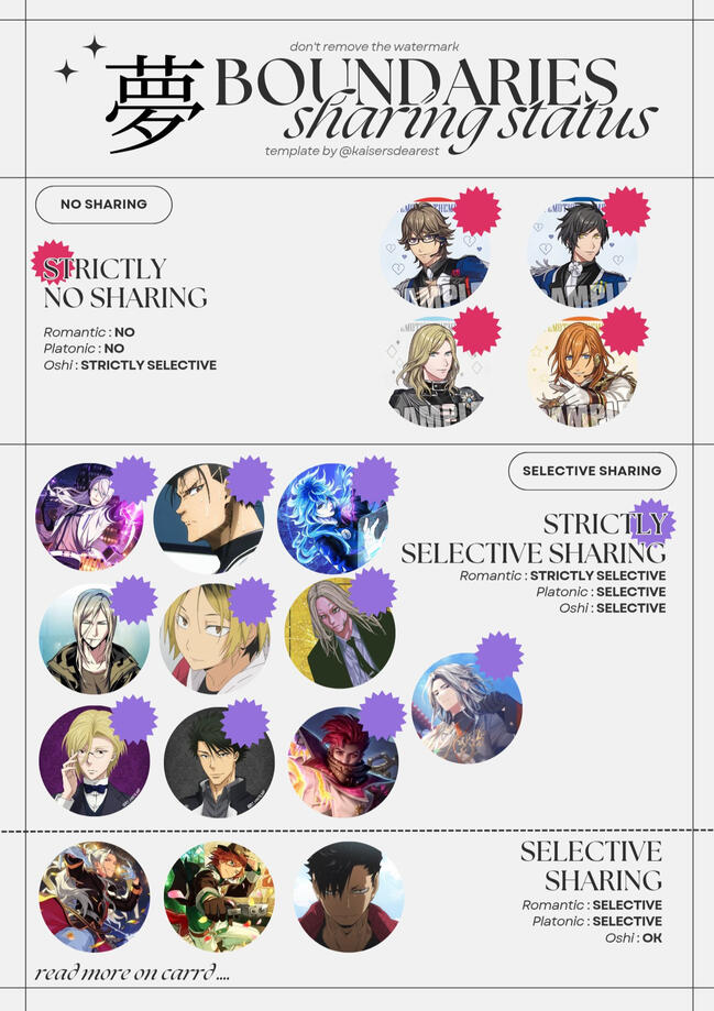 > hardblock if you talk about my notp or you do yume with my oshi (that i not sharing) or i just uncomfortable with you (this can depends on your behavior/headcanon on a characters or yume)